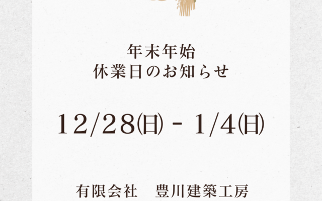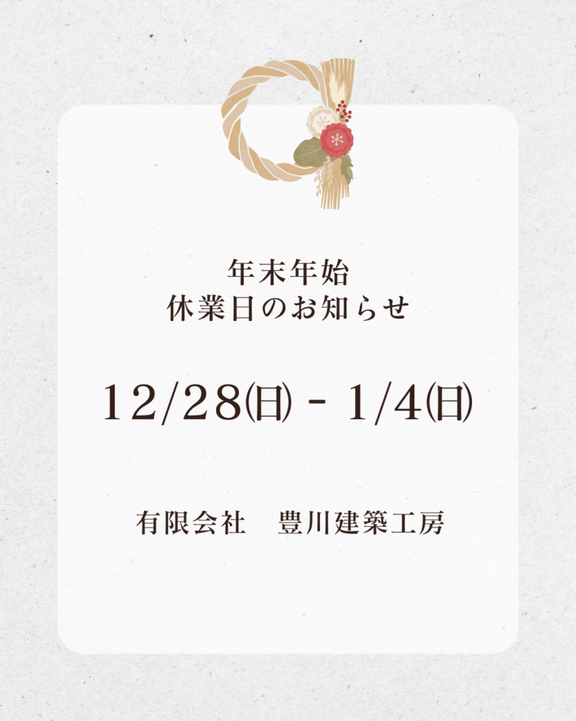 20251222 ブログ 新着情報 New!*年末年始のお知らせ* Tweet Share on Tumblr いつも豊川建築工房ブログをご覧いただき、誠にありがとうございます。 誠に勝手ながら下記期間を年末年始休業とさせていただきます。 お客様にはご不便をおかけいたしますが、何卒ご了承くださいますようお願い申し上げます。 ≪年末年始休業期間≫ 2025年12月28日(日)~2026年1月4日(日) 本年中のご愛顧に心より御礼申し上げますとともに、 来年も変わらぬお引立てのほど、宜しくお願い申し上げます。 2025年12月22日|ブログ,新着情報 新しい記事:--- 前の記事:完全予約制 構造見学会 開催 >> ブログ, 新着情報の一覧へ戻る▲